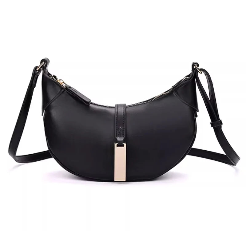 Ce sac noir, avec sa forme en croissant et son design épuré, incarne le minimalisme et l’élégance. Les détails en métal doré et la fermeture éclair visible ajoutent une touche de luxe.
