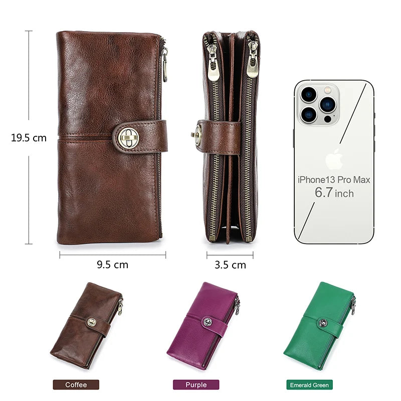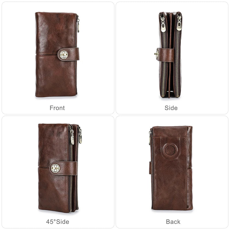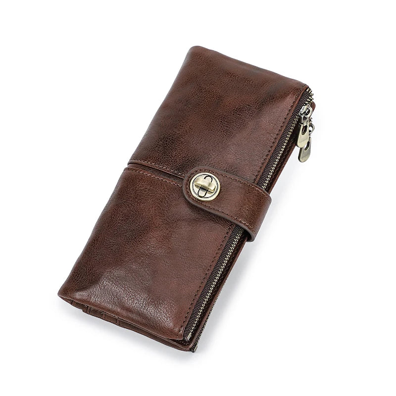 Ce portefeuille en cuir brun incarne le voyage intérieur autant que les escapades lointaines. Sa silhouette élancée, ponctuée de deux zips parallèles et d’un fermoir métallique, évoque les routes qui se croisent sans jamais se confondre.