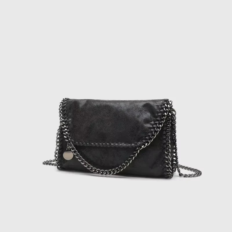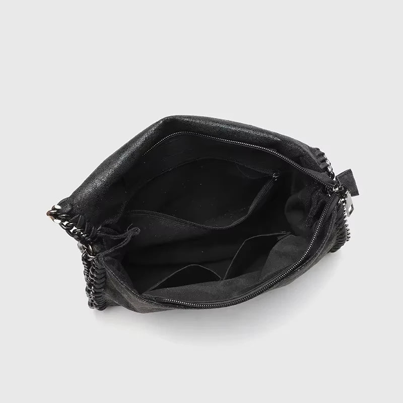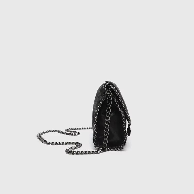 Ce modèle joue sur les contrastes entre matière brute et détails raffinés. Le cuir PU noir, associé à une chaîne sombre, crée une silhouette audacieuse et sophistiquée. Parfait pour les looks urbains et les soirées électrisantes.