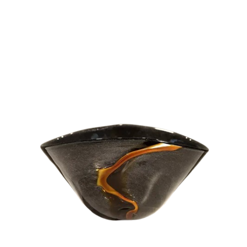 Le contraste entre le noir profond et la trace lumineuse crée un paysage minéral. Une pièce qui semble née d’un crépuscule ardent.