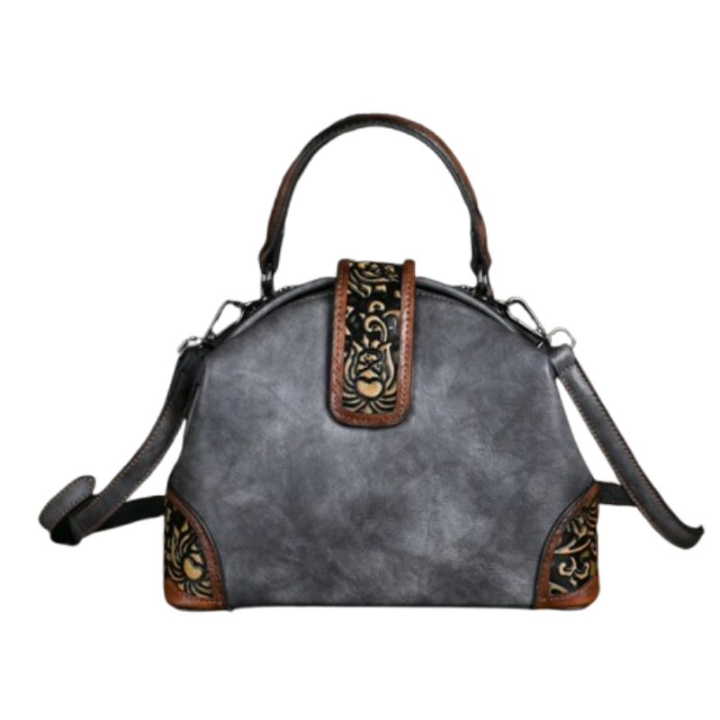 Ce sac gris, enrichi de découpes florales dorées et brunes, allie discrétion et éclat. Sa forme arrondie et ses finitions soignées en font un compagnon de choix pour les journées élégantes ou les soirées raffinées.