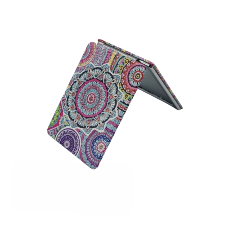 Ce miroir compact trace des galaxies dans la paume. Ses motifs circulaires murmurent des trajectoires invisibles. Un accessoire cosmique pour les visages qui voyagent loin.
