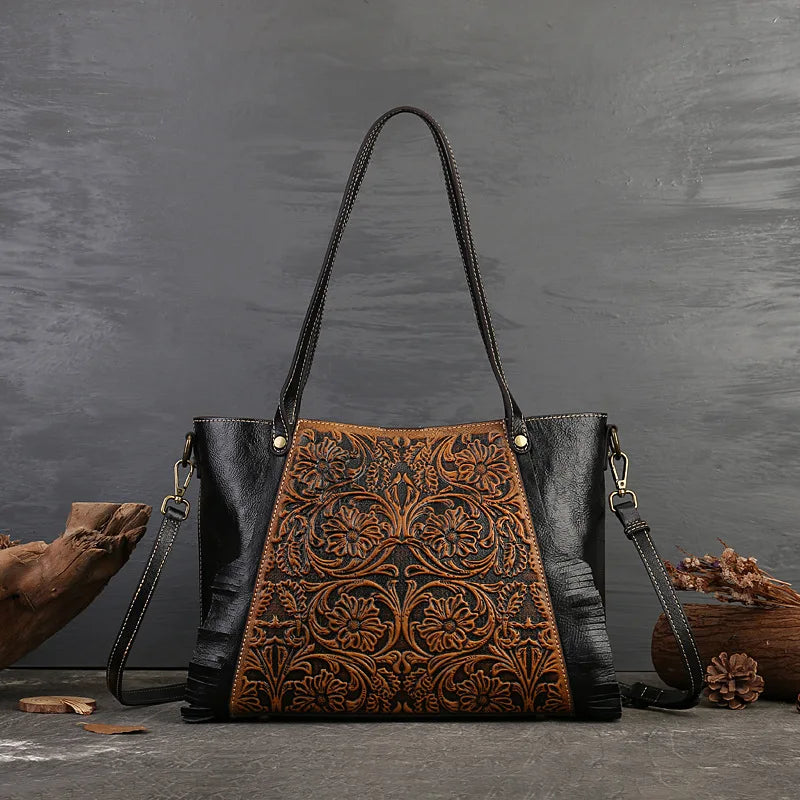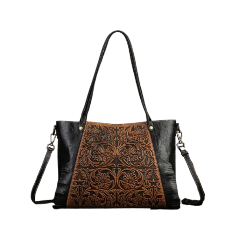 Un sac en cuir embelli par des motifs floraux qui semblent fraîchement cueillis. Chaque fleur est minutieusement travaillée, apportant une touche de charme et de romantisme à votre style .