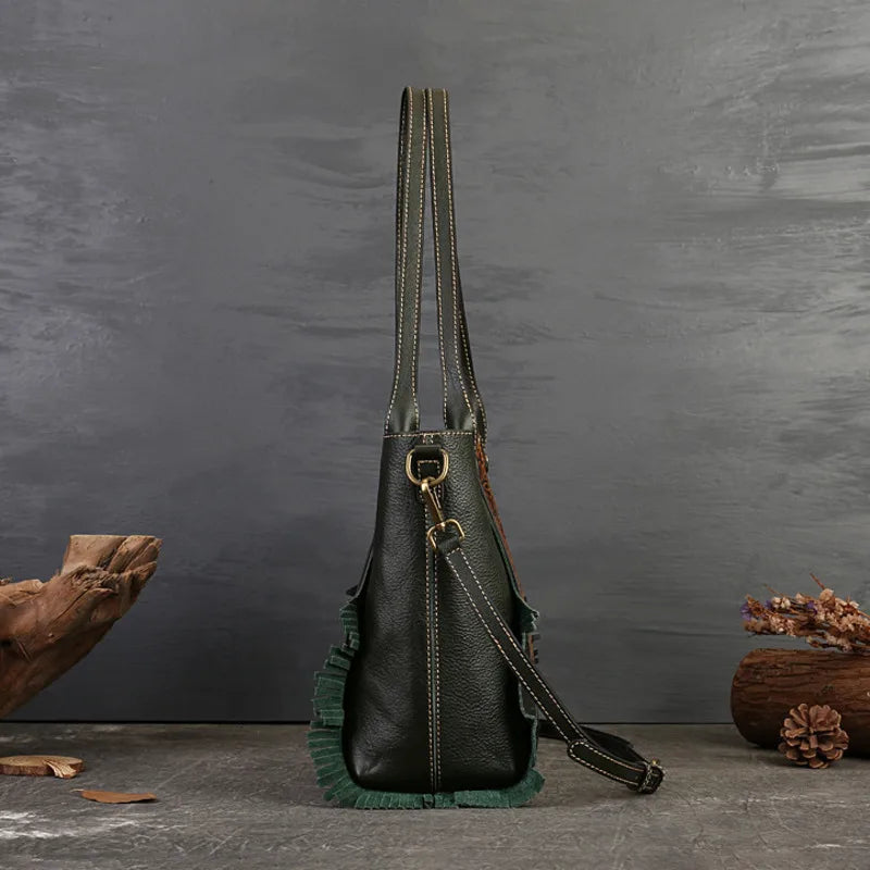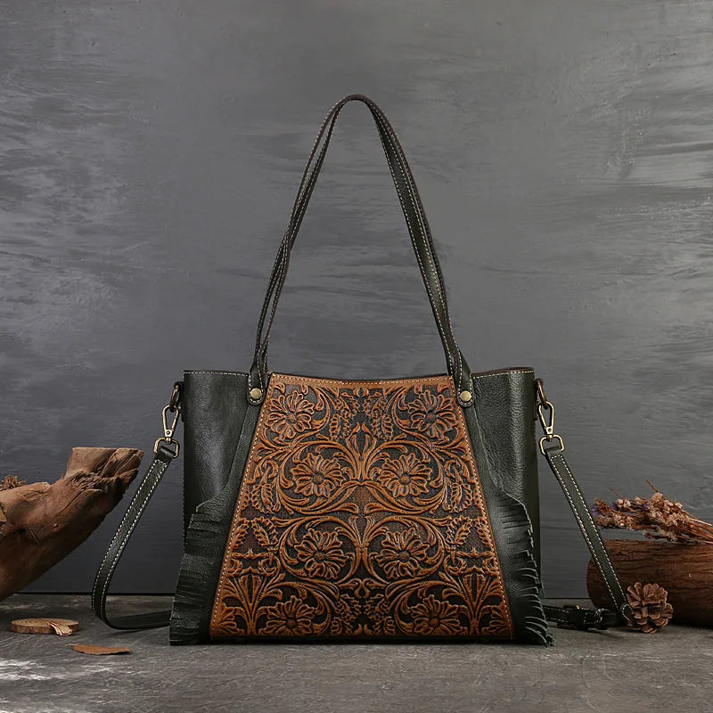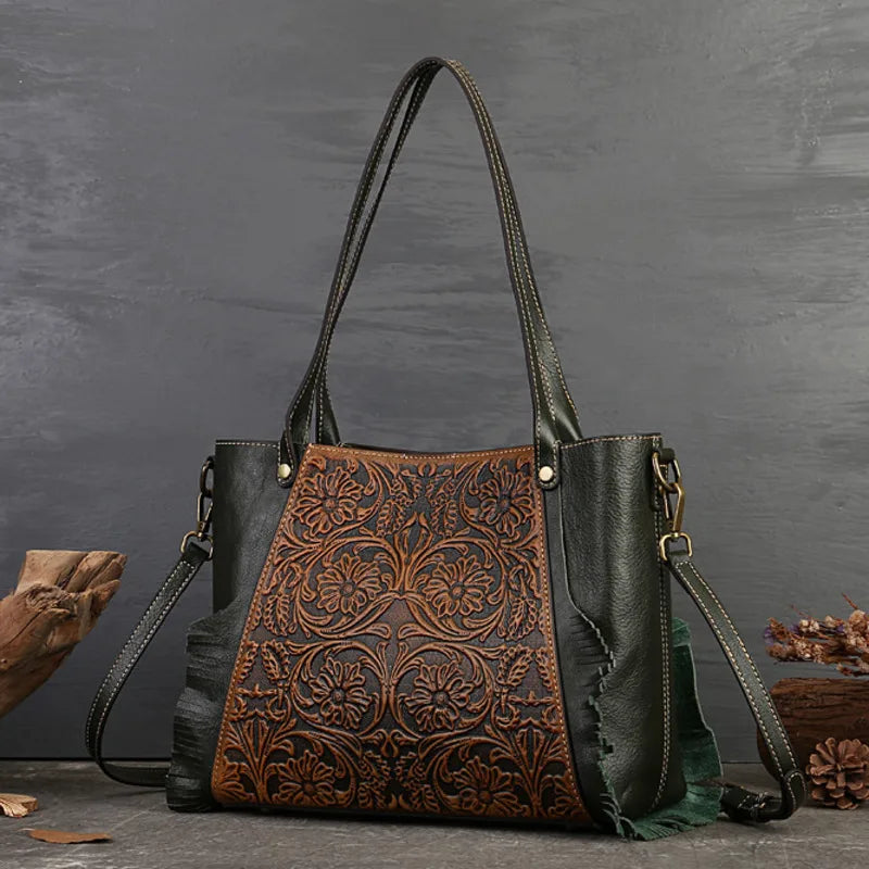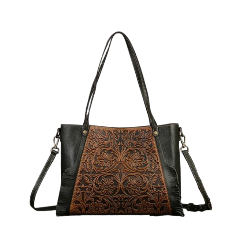 Ce sac en cuir vintage célèbre la beauté éternelle des roses. Le motif floral central est une ode à la délicatesse et à l’élégance, parfait pour ajouter une touche de raffinement à votre tenue.