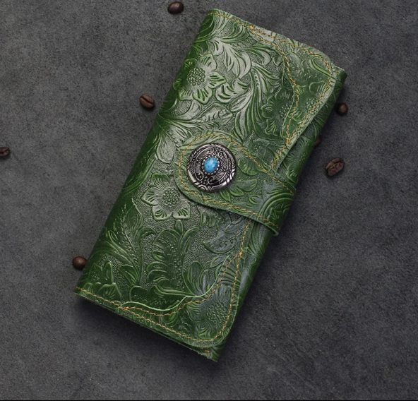 Ajoutez une touche de nature à votre quotidien avec ce portefeuille vert en cuir, magnifiquement orné de motifs floraux embossés. Son fermoir à rabat est sécurisé par un bouton décoratif en métal, agrémenté d'une pierre bleue au centre, apportant une touche de raffinement à l'ensemble. Pratique et élégant, ce portefeuille est idéal pour organiser vos essentiels tout en reflétant votre sens du style unique.
