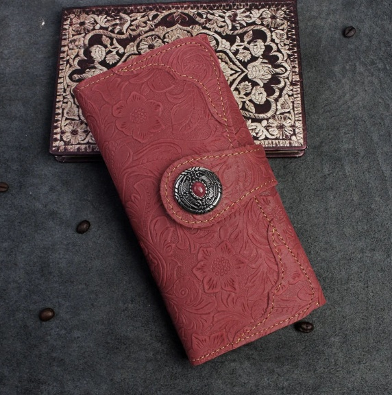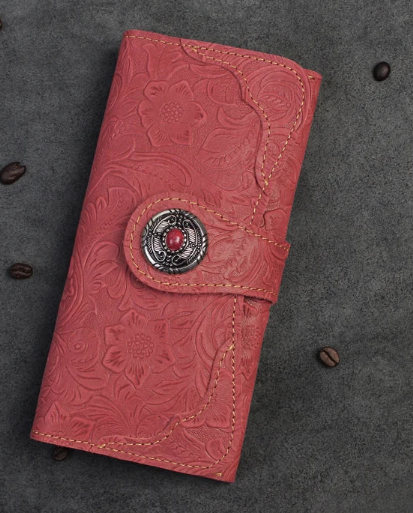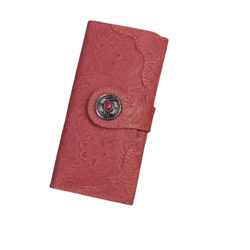 Faites sensation avec ce portefeuille rouge en cuir, magnifiquement décoré de motifs floraux embossés. Son fermoir à rabat, orné d'un bouton décoratif en métal avec une pierre rouge, ajoute une touche de sophistication et de charme. Pratique et élégant, ce portefeuille est parfait pour organiser vos essentiels tout en apportant une touche de couleur et de style à votre quotidien.