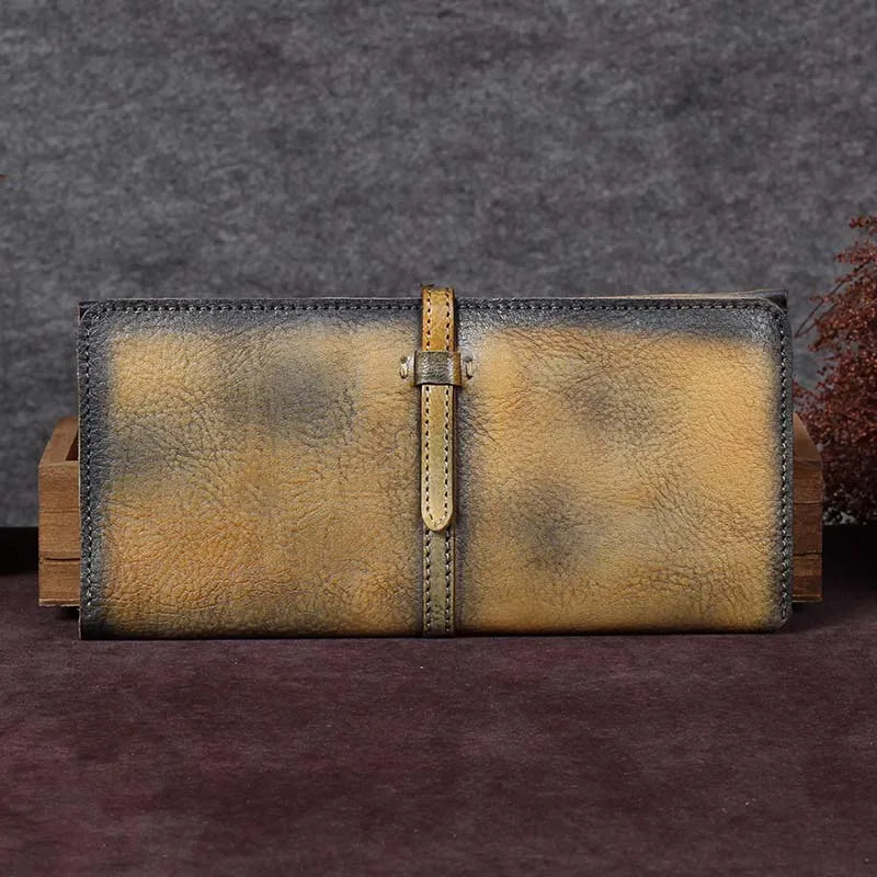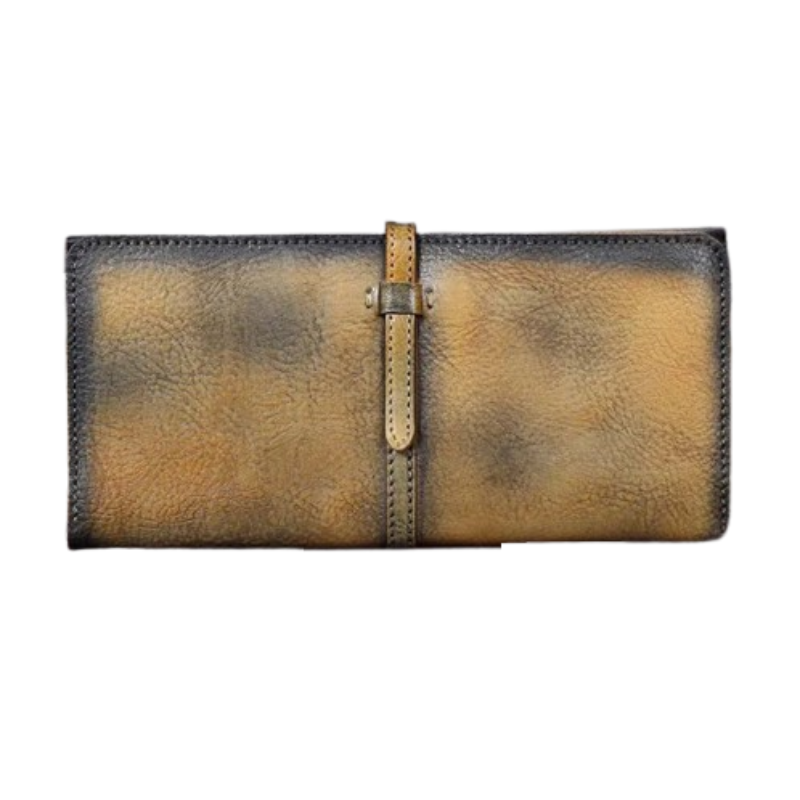 Laissez-vous séduire par ce portefeuille en cuir jaune, dont le design vieilli et les détails soignés racontent une histoire. La texture du cuir et la fermeture à sangle confèrent à cet objet une allure à la fois robuste et raffinée. Un compagnon idéal pour ceux qui apprécient l’élégance du passé.
